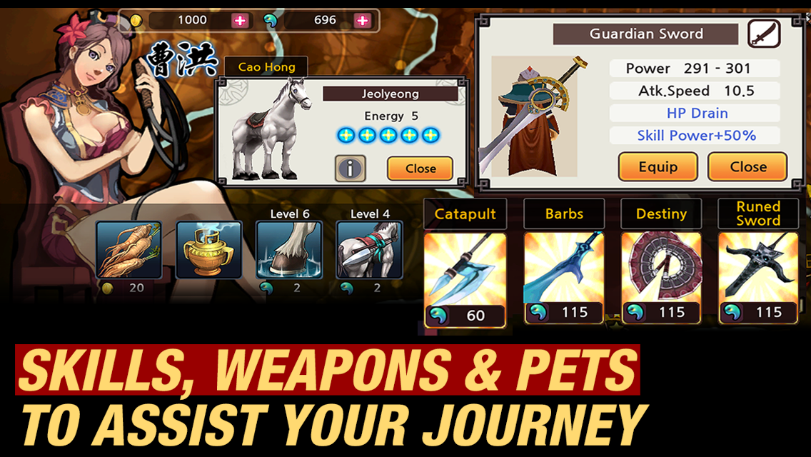 Generales actúen con armas originales y habilidades que incluyen arcos y flechas, lanzas, abanicos, espadas dobles, qigong, hachas, y más!